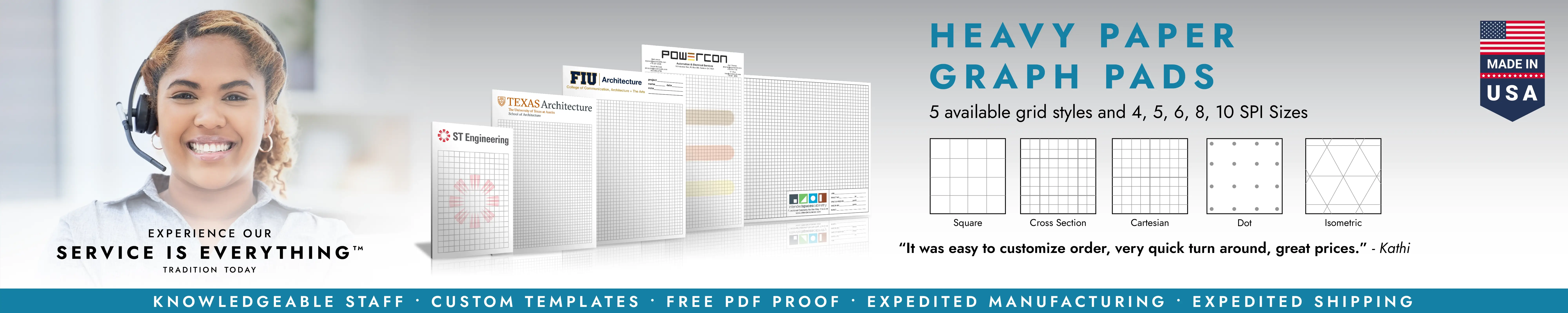There is no minimum order and we can ship within one business days. Whether you need your heavyweight custom graph pads overnight or within our standard 4 day turnaround schedule, you can expect the same high quality and consistent product each time you place an order.
