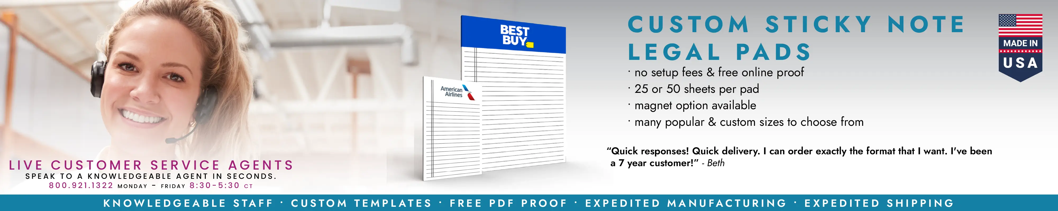 Speed | Expedited manufacturing and shipping, with orders shipping as quickly as one business day. | Get your custom sticky notes fast! |
